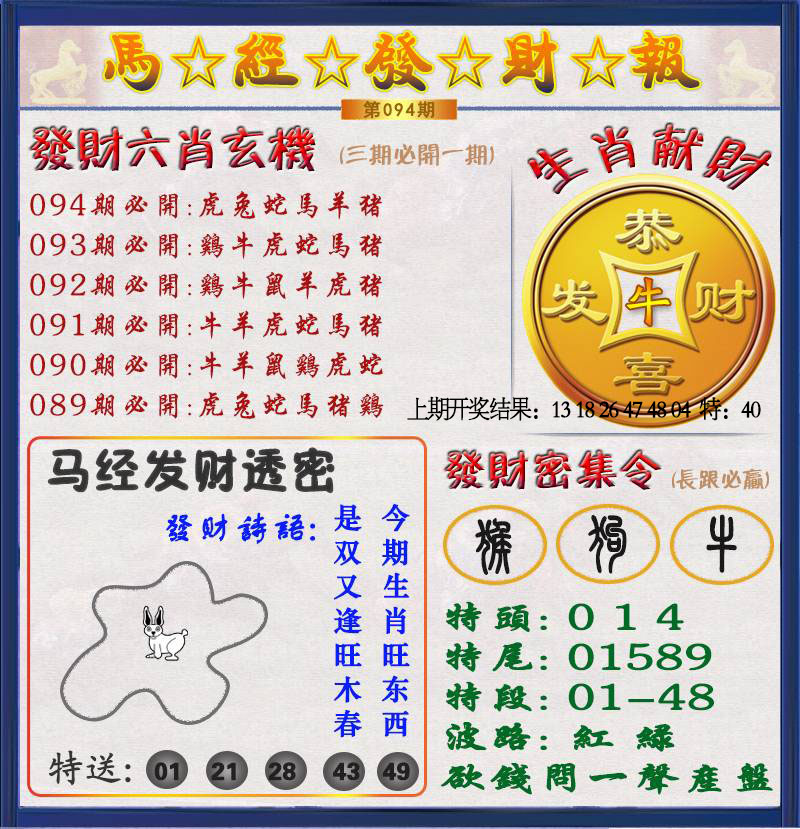 094期: 澳门六合皇彩圖信封【平财神报】每期自动更新